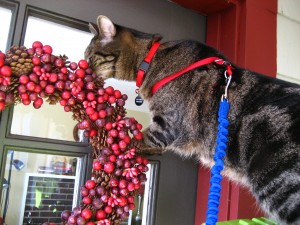 You may wonder how exactly one walks a cat. Well, truth be told, the cat walks you. And it’s not so much a walk as it is a meandering. We meander. Occasionally we hop…or sprint…or pounce. Generally the ‘walk’ turns into a mission. A mission to find things to eat (that shouldn’t be eaten), places to lay or things to pounce.